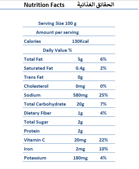 Ingredients: Rice, Green Pepper, Tomato, Onions, Dill, Garlic, Mint, Black pepper, Soya oil, Salt, Water, Acidity regulator (Citric acid). Net Weight: 400g drained weight:380g Net Weight: 750g Production & Expiry date: see top of the lid Keep in cold dry place, away from direct sunlight Keep refrigerated after opening